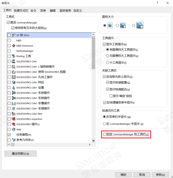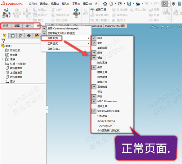 缺失按钮区一些必要模块区域,无法通过常规手段设定,常规的设定是在按钮区具体的选项卡【比如特征】上右键菜单显示出来。以及,按钮区选项卡上缺失部分功能的图标。