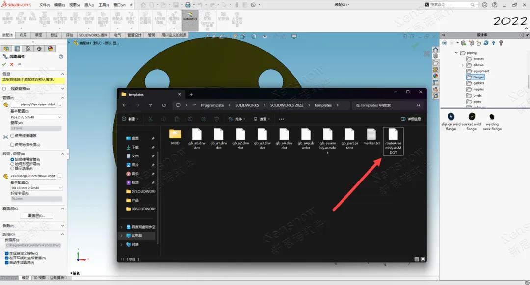 出现这个弹窗明显是找不到创建布路时所使用的布路模板了(routeAssembly.ASMDOT),布路模板是一种特殊的装配体模板,专门用于布路使用。按照正常的逻辑,在我们新建一个布路子装配体的过程中如果默认的安装目录下不存在布路模板则会在此处利用 SOLIDWORKS 后台程序自动创建,用户无感。那么出现用户的这个弹窗必然是不能利用 SOLIDWORKS 自动创建生成管路布路模板,或 Routing Library Manager 中所指定的默认布路模板路径无效或不可用!