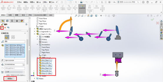 05、如果想要继续爆炸其中的子装配体,我们首先要勾选上“选择子装配体零件”。然后在设计树中展开需要爆炸的子装配体。留下一个固定的,其余的都选上。用鼠标将子装配体左右或者上下拉开。点击完成,点击确定。