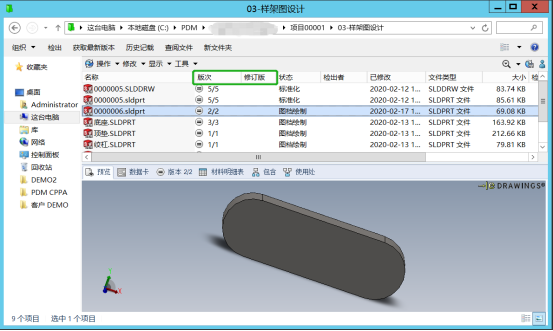 通过SOLIDWORKS CAD可以直接将设计数据保存在PDM客户端中, 并可通过P DM 预览功能查看设计数据。设计完成,可将数据检入服务器,系统会记录本次检入的版本。对于PDM而言,版本管理分为两个概念,一个是 版次,一个是 修订版。版次指的对于设计数据修改过程的管理,这个对于建立企业研发产品知识库非常有用。修订版指的设计数据在通过审签流程后,最终用于生产或者采购的定版,例如A1,A2,A3……