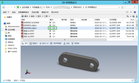 此时可以发现,版次就变成了3/3,预览可以发现新增了两个通孔。 这说明此零件新增加了版次,并且没有生成新的文件,新版次是叠加在旧版次基础上。当我们需要查看以前的版次,或者在装配零部件需要参考旧的版次,都可以追溯选择旧的版本。