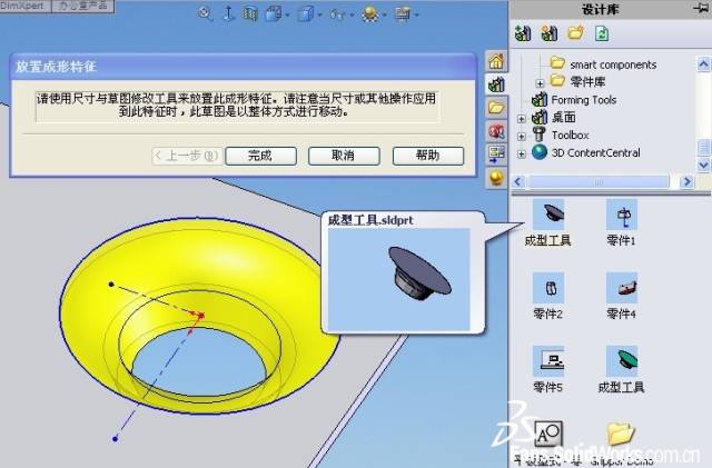 明白了原理,就可以用零件格式(*.sldprt)的文件生成成型工具了,不过,千万要记得,设计库中必须将此文件所在的文件夹设定为成型工具文件夹。新的成型工具使用如下(注意对比图三的成型工具预览框所显示的文件格式):
