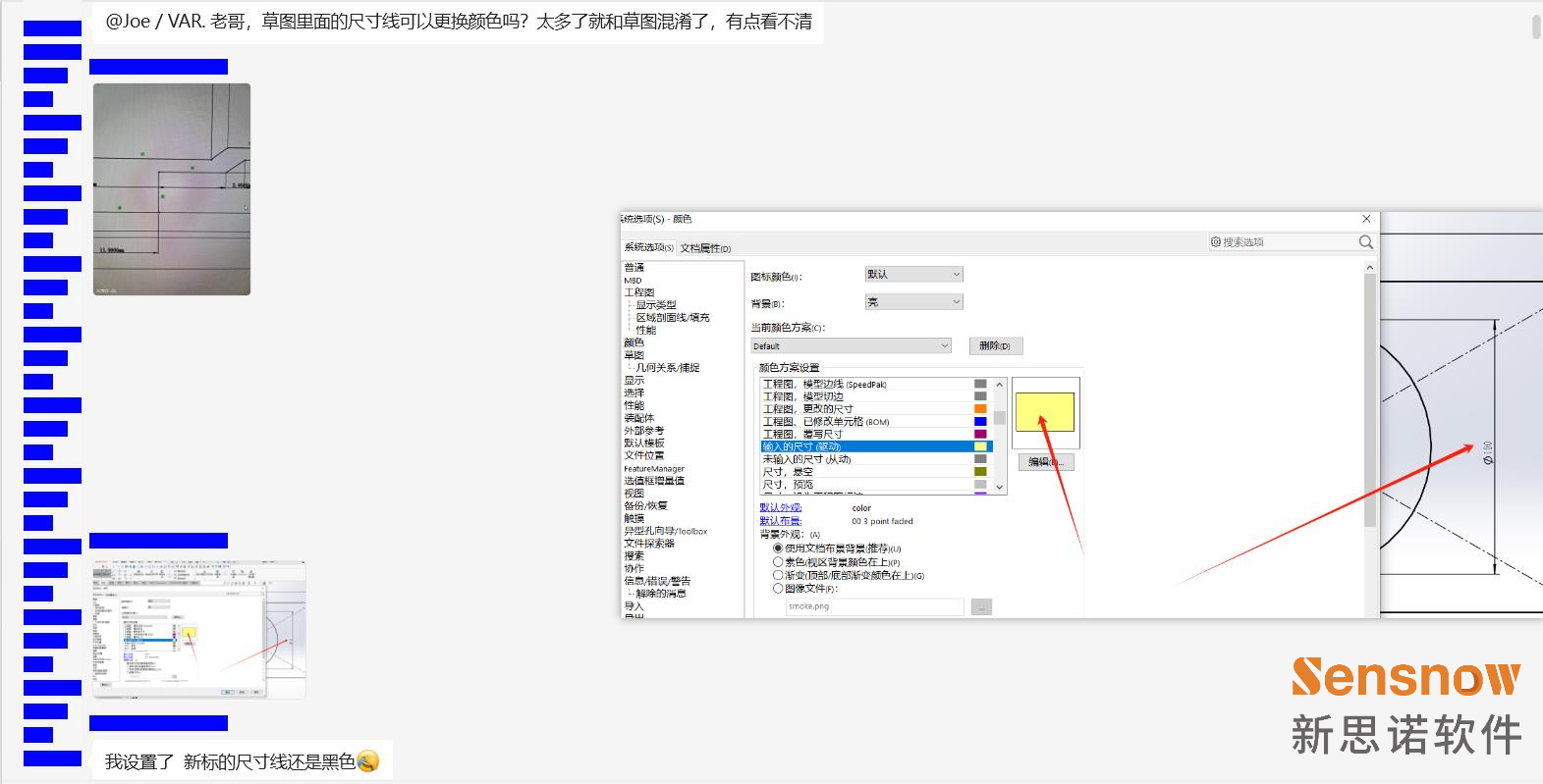 已经单独指定了草图驱动尺寸的颜色,但是创建智能尺寸后还是默认的黑色,客户希望可以将草图尺寸更改自定颜色。
