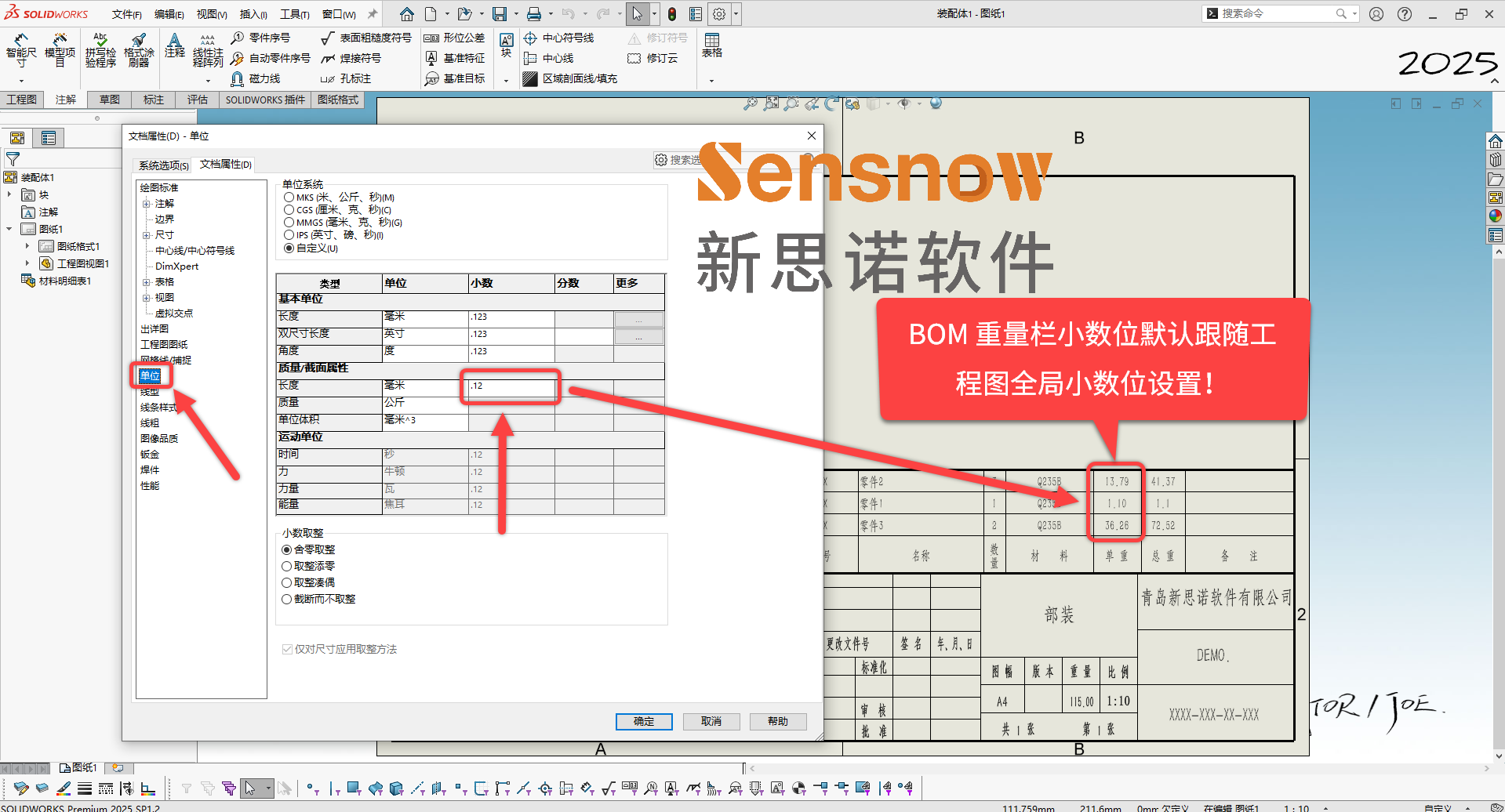 SOLIDWORKS 2017 及之前版本工程图 BOM 是以零件模型的单位小数位来显示,所以必须修改(零件和装配体模型的):选项 -> 文档属性 -> '单位' 以匹配工程图 BOM 的质量单位。
