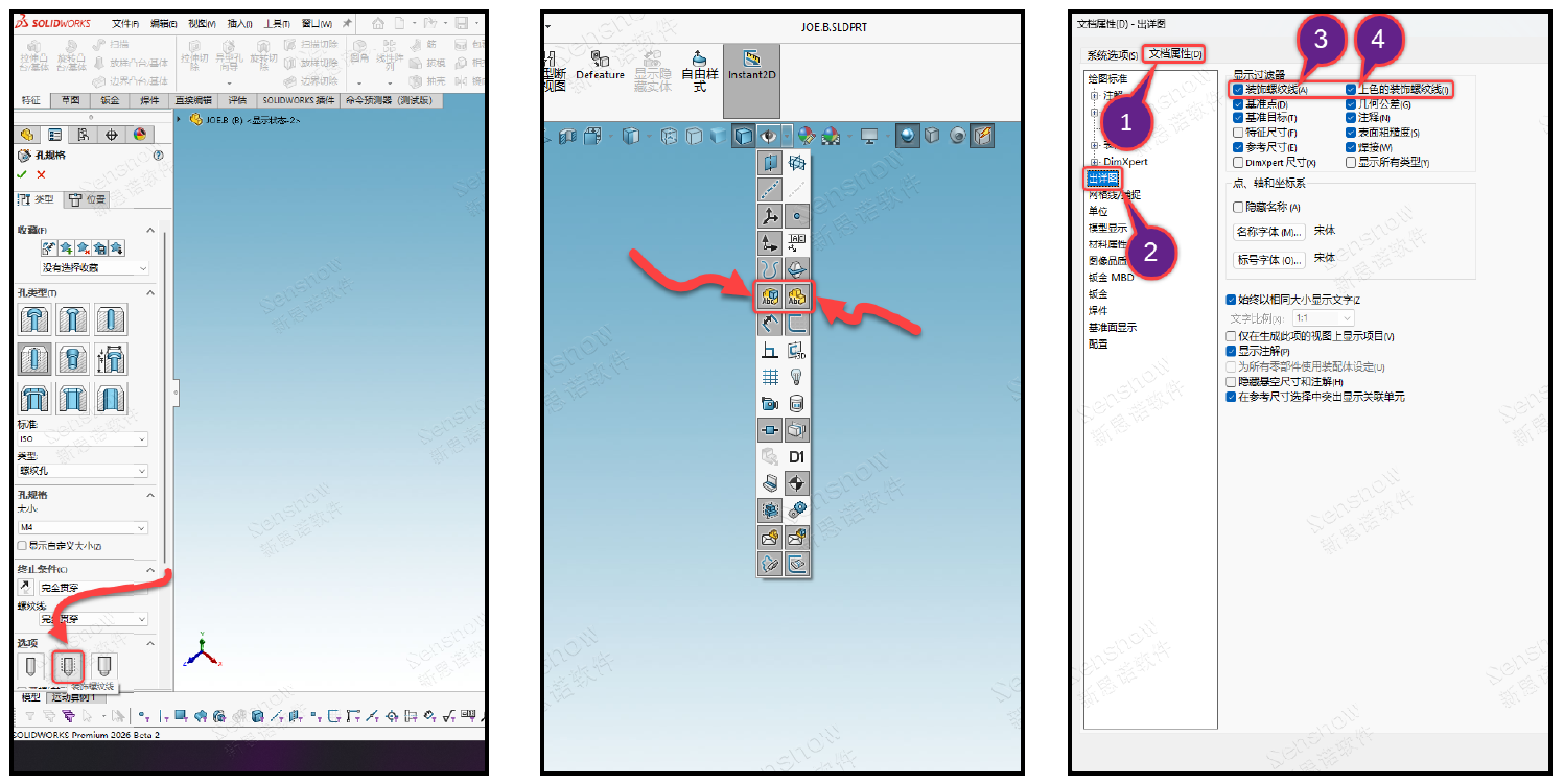 在我们打孔的特征中检查有没有使用显示装饰螺纹线的选项,编辑打孔特征(异型孔向导特征)-> 选项 -> 装饰螺纹线。