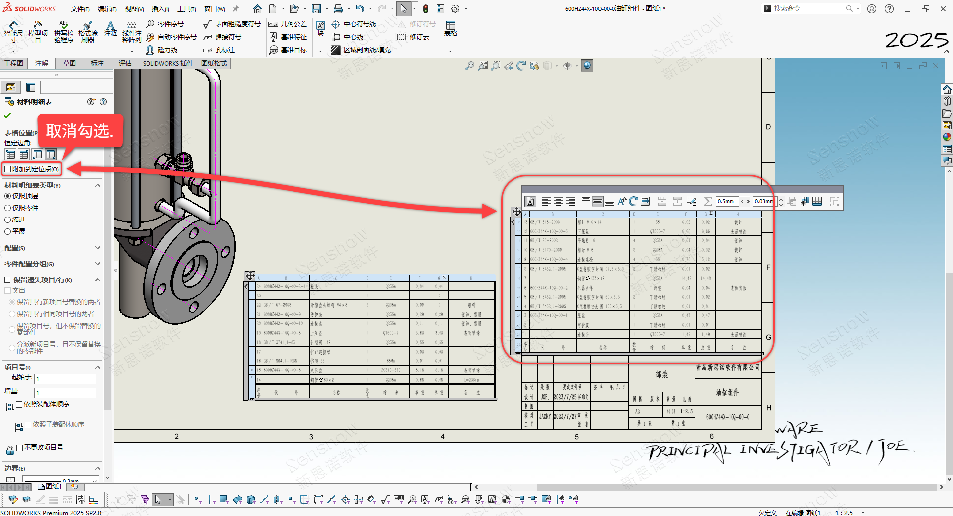 1、将 BOM 拆分后对在标题栏上方显示的表格执行取消 '附加到定位点';